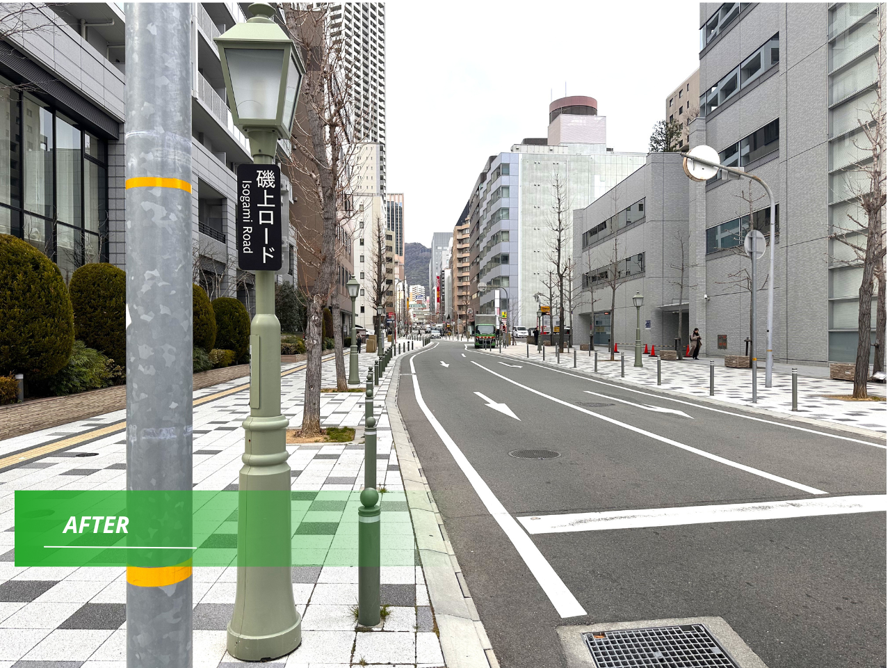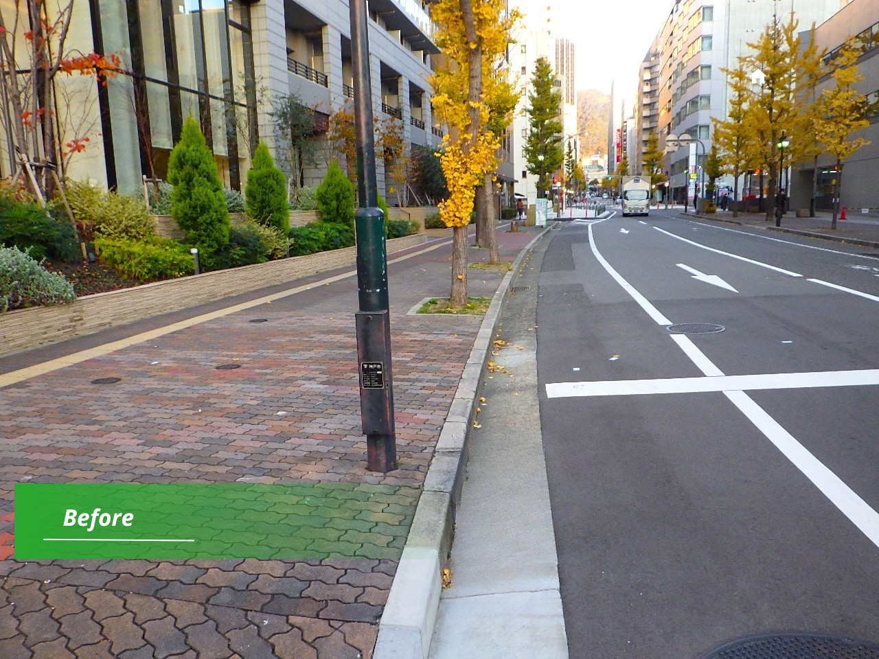 神戸市の葺合54号線にて、老朽化した歩道舗装の改修工事を行いました。